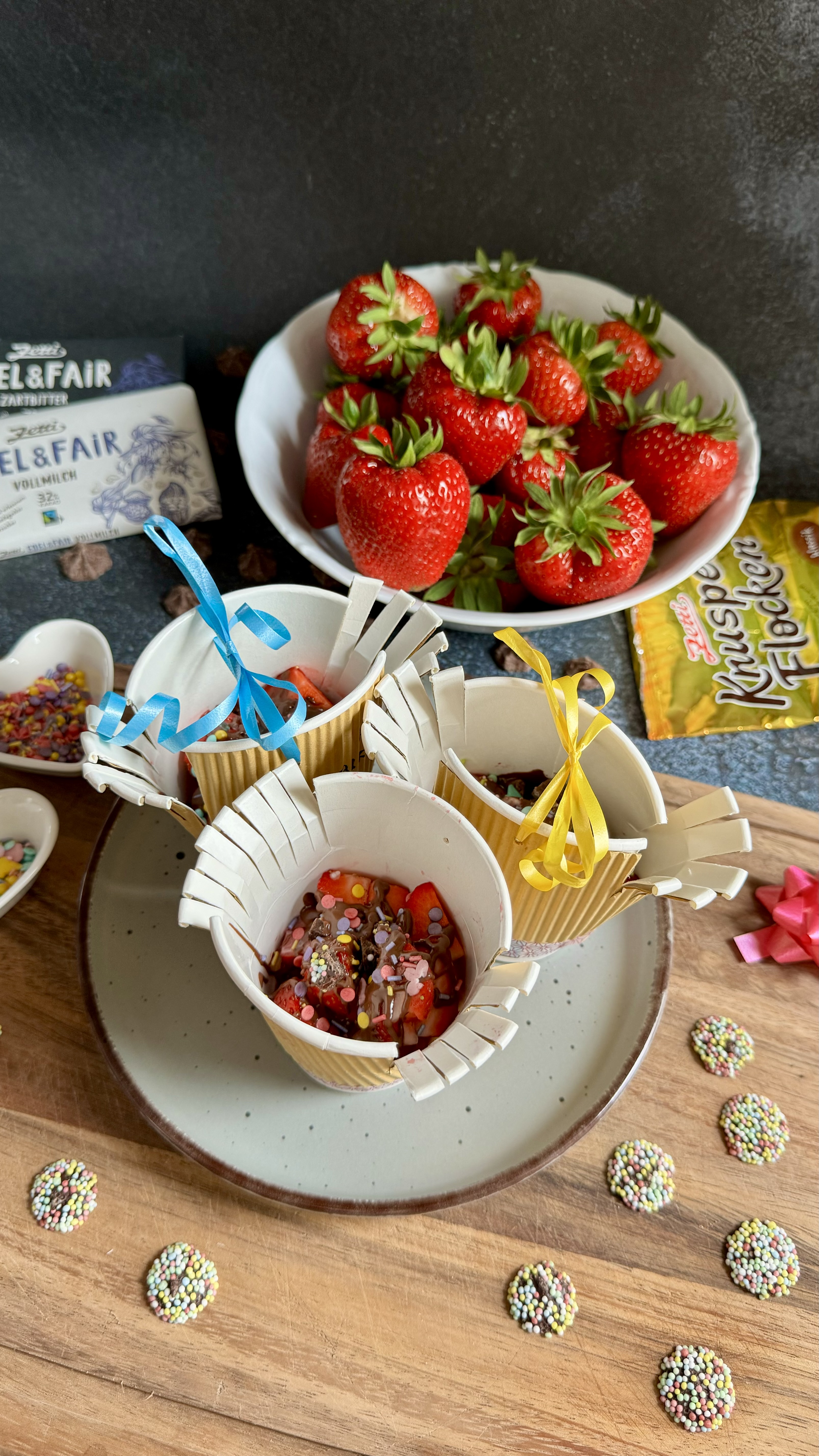 Ich habe diese wahnsinnig leckeren Erdbeer-Schoko-Becherchen gemacht. Die sind ein tolles Mitbringsel zur nächsten Grillparty oder für den Kindergeburtstag in der Schule mein absoluter Favorit: die Toppings sind super wandelbar und ihr könnt fast alles nehmen, was ihr gern mögt. Ich habe mich für Zetti Knusperflocken, Schokoladenplätzchen & bunte Streusel entschieden.