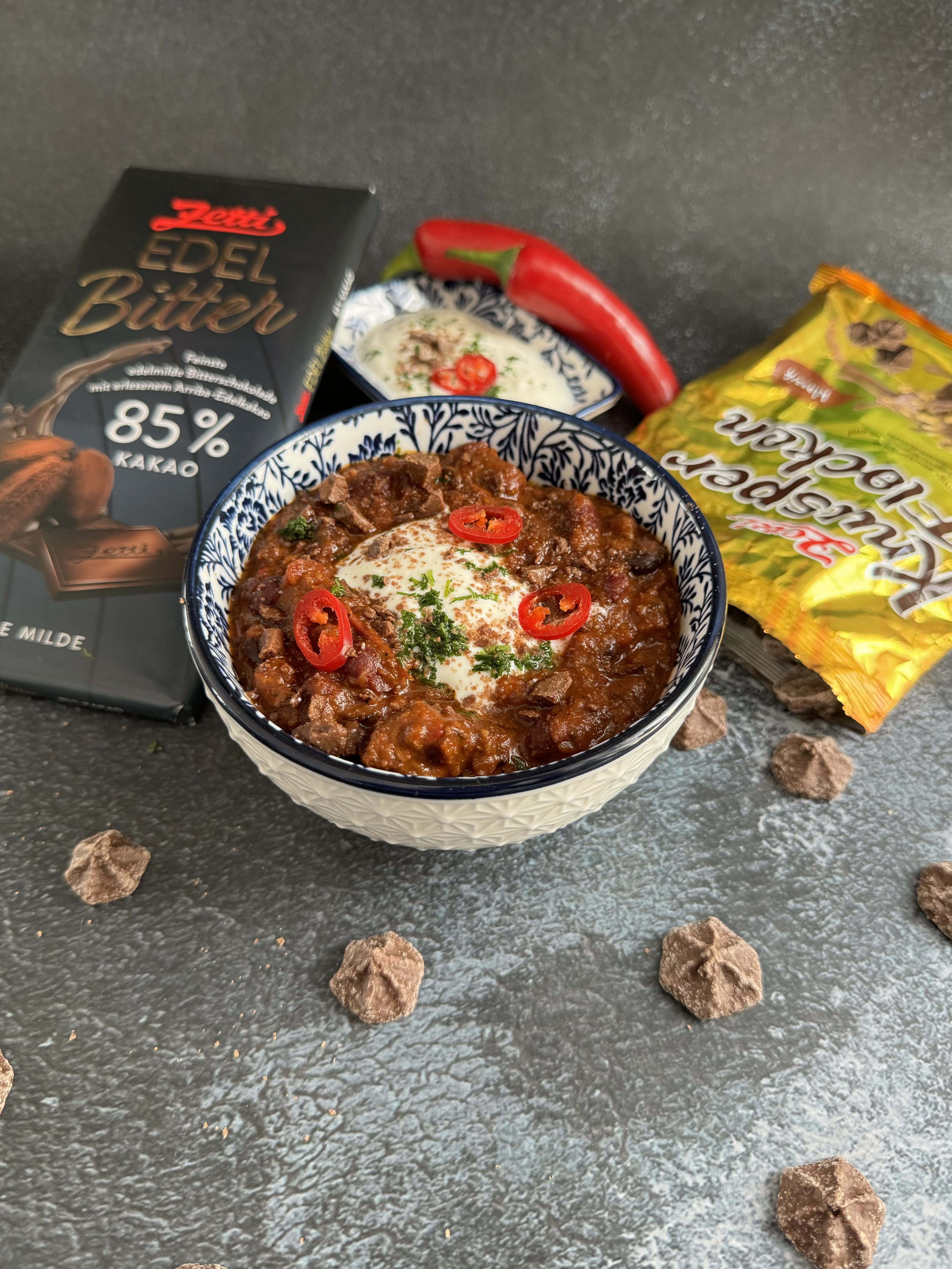 Dieses super würzige & aromatische Chili ist nicht nur ein echter Partyknaller, sondern lässt sich auch gut in großen Mengen vorbereiten. Pro-Tipp: einen Tag vorher kochen und richtig durchziehen lassen. Dunkle Schokolade wie die Zetti Edelbitter mit 85% Kakao runden dieses Chili perfekt ab!